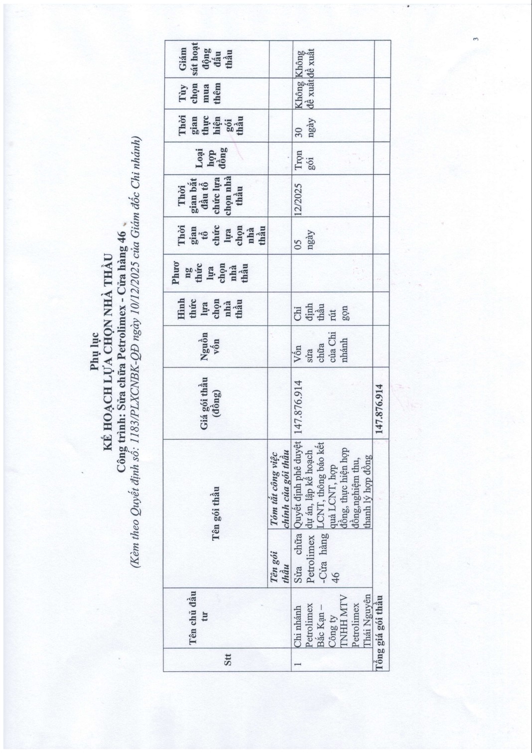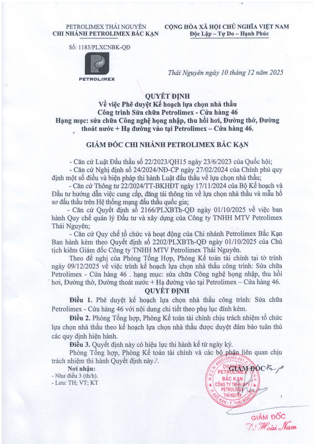 Theo đề nghị của Phòng Tổng Hợp, Phòng Kế toán tài chính tại tờ trình ngày 09/12/2025 về việc trình kế hoạch lựa chọn nhà thầu công trình: Sửa chữa Petrolimex - Cửa hàng 46 . hạng mục: sửa chữa Công nghệ họng nhập, thu hồi hơi, Đường thở, Đường thoát nước + Hạ đường vào tại Petrolimex – Cửa hàng 46.