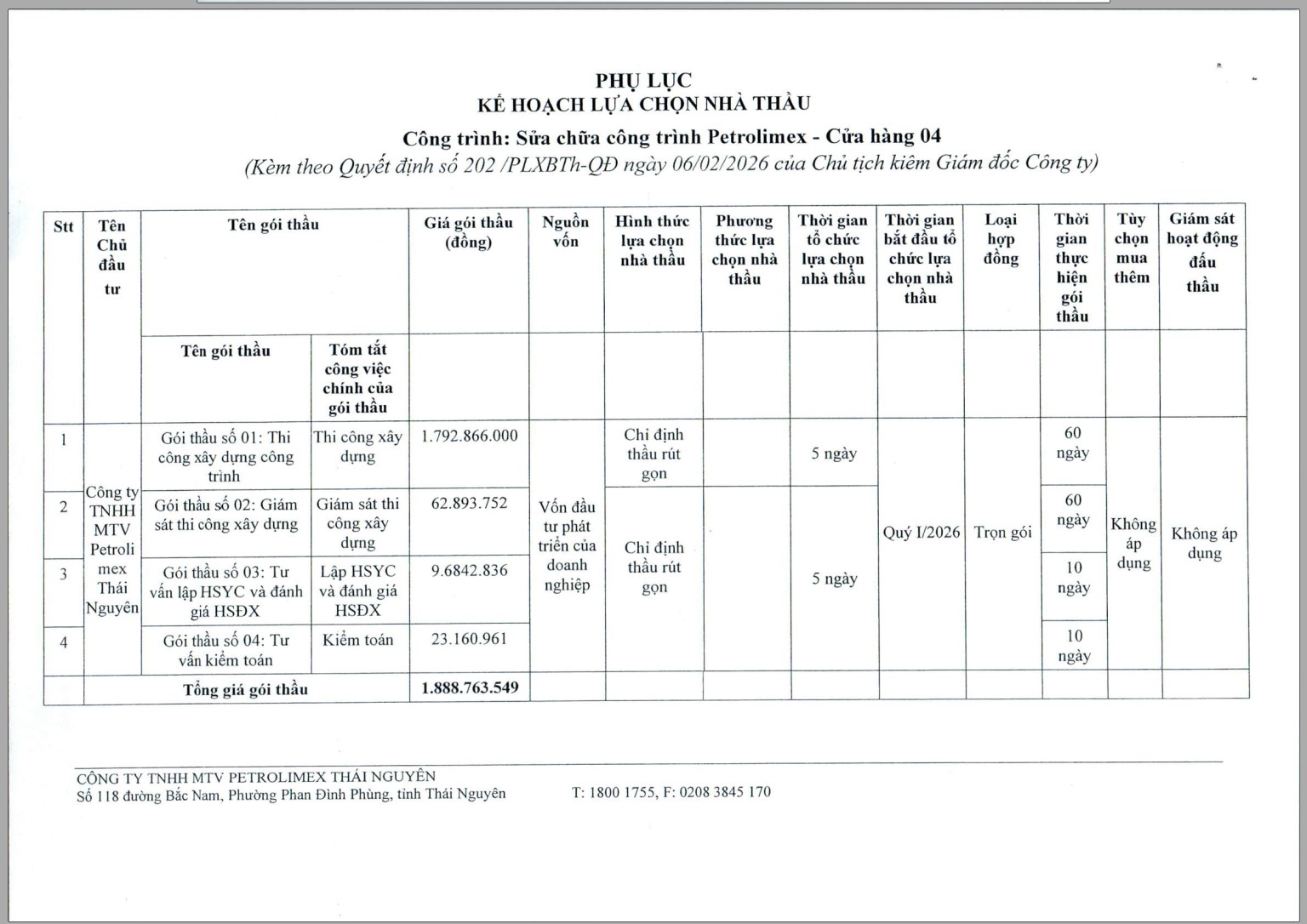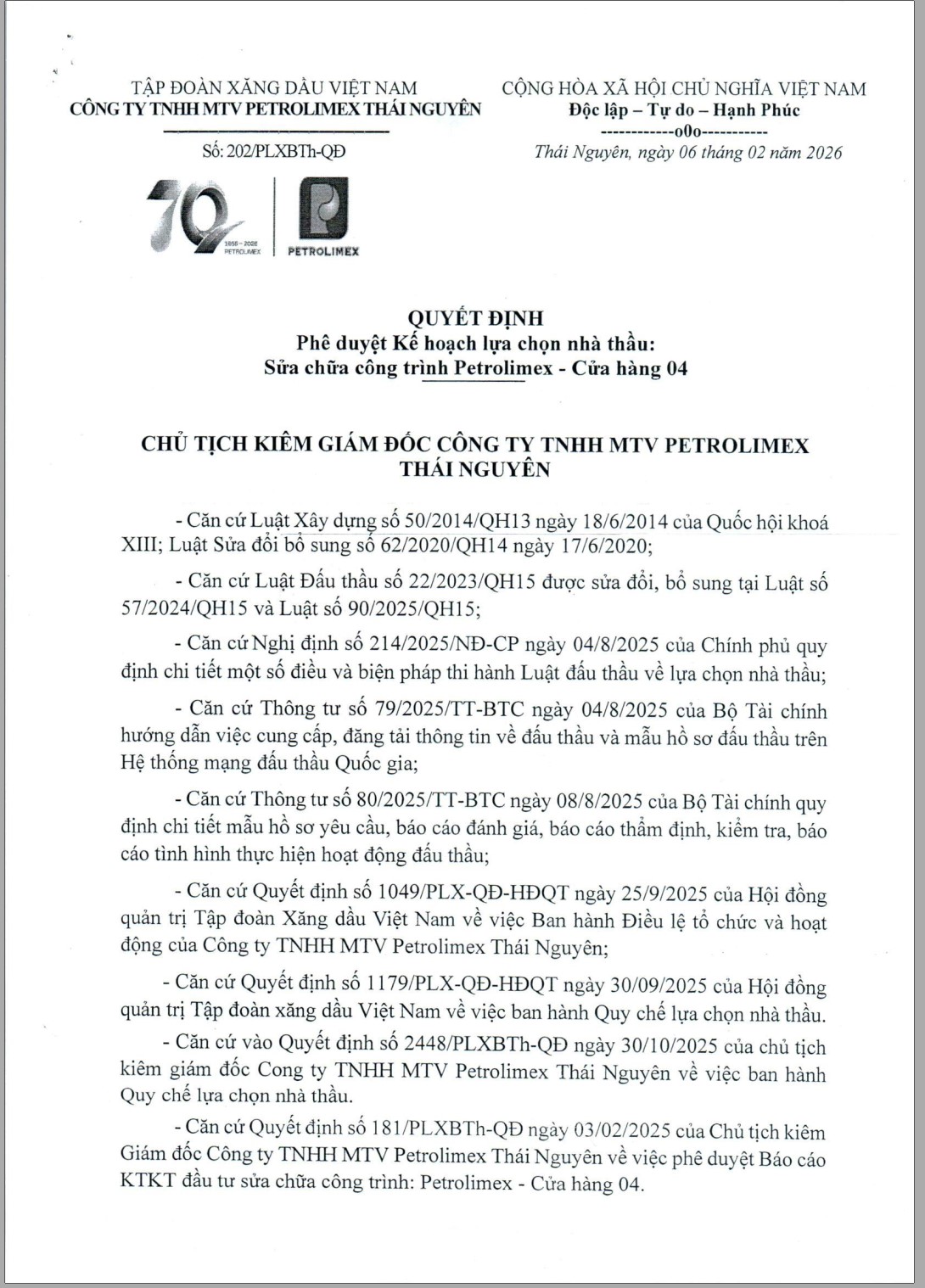 - Căn cứ vào Quyết định số 2448/PLXBTh-QĐ ngày 30/10/2025 của chủ tịch kiêm giám đốc Cong ty TNHH MTV Petrolimex Thái Nguyên về việc ban hành Quy chế lựa chọn nhà thầu.