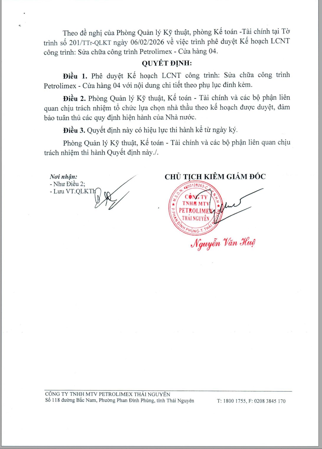 Theo đề nghị của Phòng Quản lý Kỹ thuật, phòng Kế toán -Tài chính tại Tờ trình số 201/TTr-QLKT ngày 06/02/2026 về việc trình phê duyệt Kế hoạch LCNT công trình: Sửa chữa công trình Petrolimex - Cửa hàng 04.